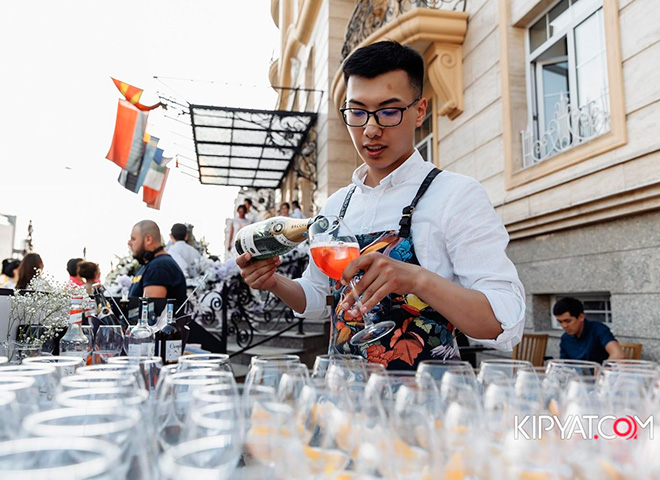 Вечер проходил под открытым небом. Бармены угощали гостей фирменными коктейлями от Бахус, которые были также разнообразны, как и публика, приглашённая на показ. Каждый гость подобрал напиток себе по вкусу. По словам самой хозяйки вечера её любимый коктейль ― рубиновый сауэр на основе красного сухого вина Жар-Жар.