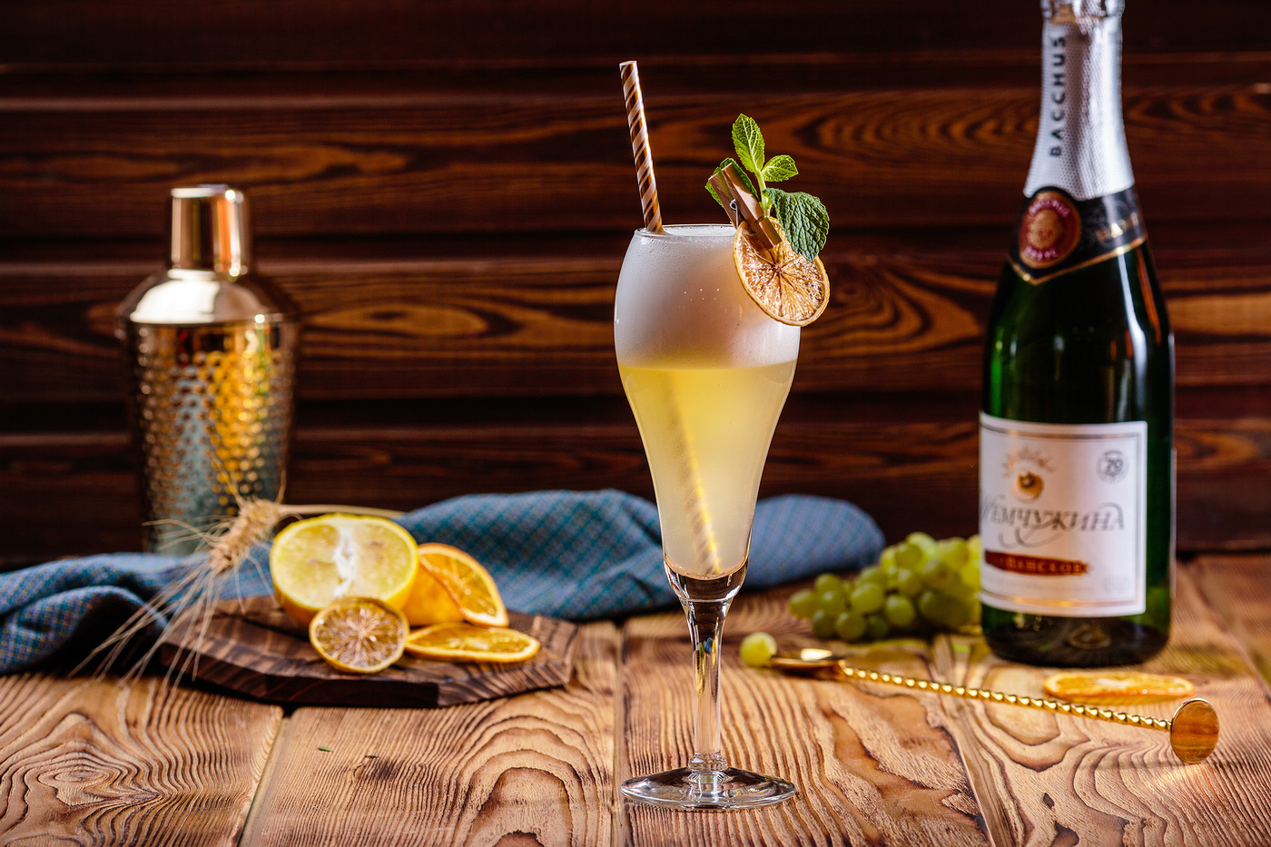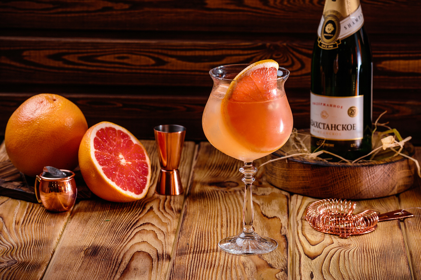 Чтобы его приготовить, нужно 100 мл выдержанного игристого вина-брют «Казахстанское», 30 мл фреша грейпфрута и 20 мл меда.