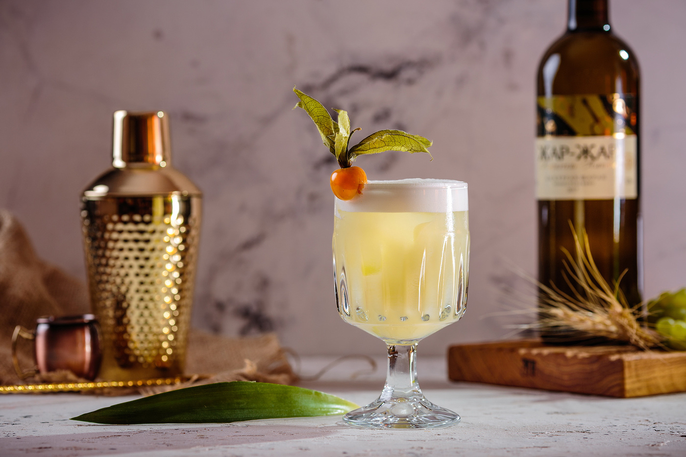 Нам понадобится 100 мл белого сухого вина «Жар-Жар», 15 мл джема алоэ, 15 мл джема лимона, 20 мл лимонного сока, и 20 мл яичного белка. Все ингредиенты по очереди добавляем в шейкер, тщательно взбиваем, переливаем в бокал, для придания законченного вида можно украсить коктейль земляной клюквой или любыми другими ягодами.